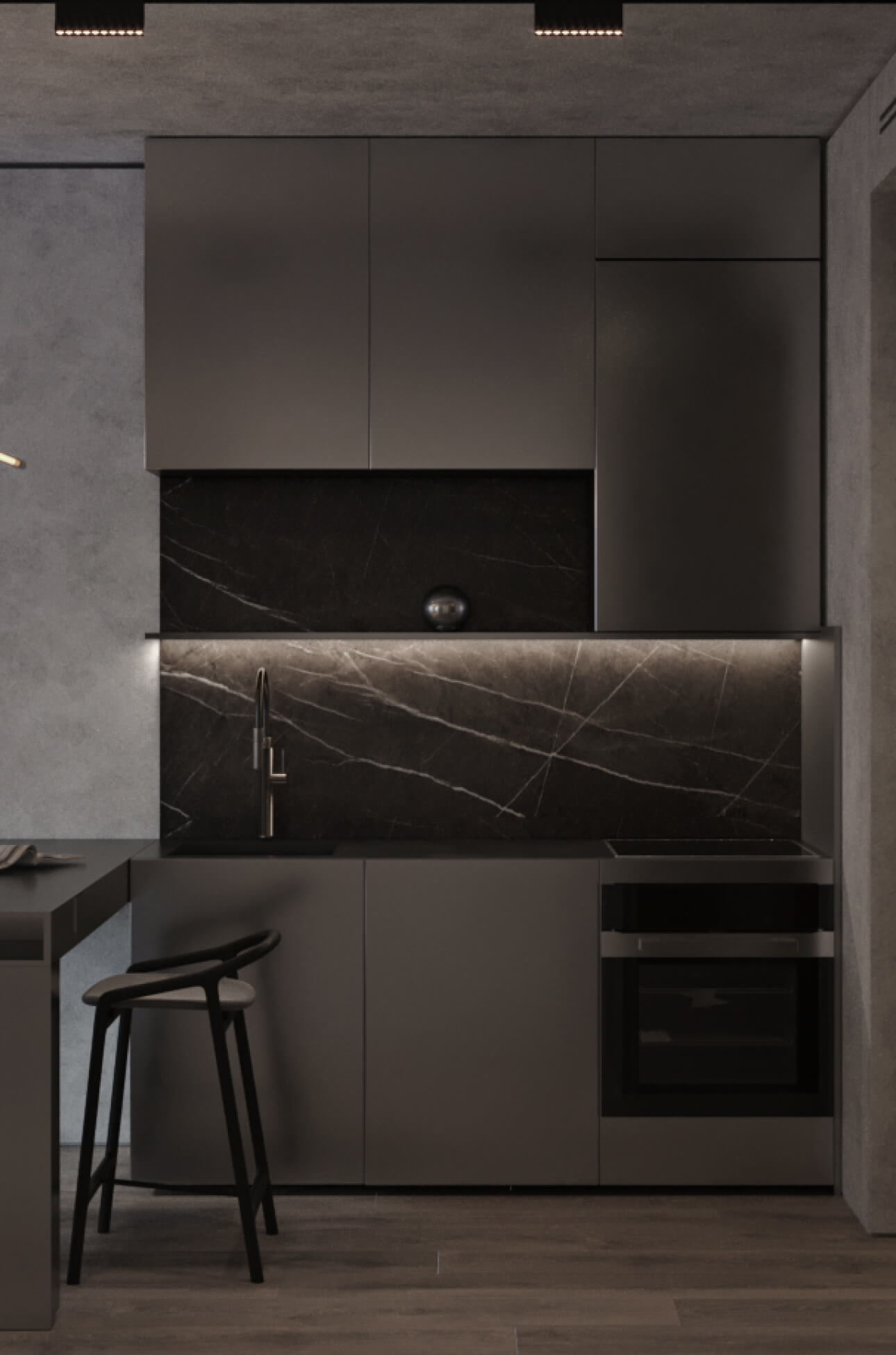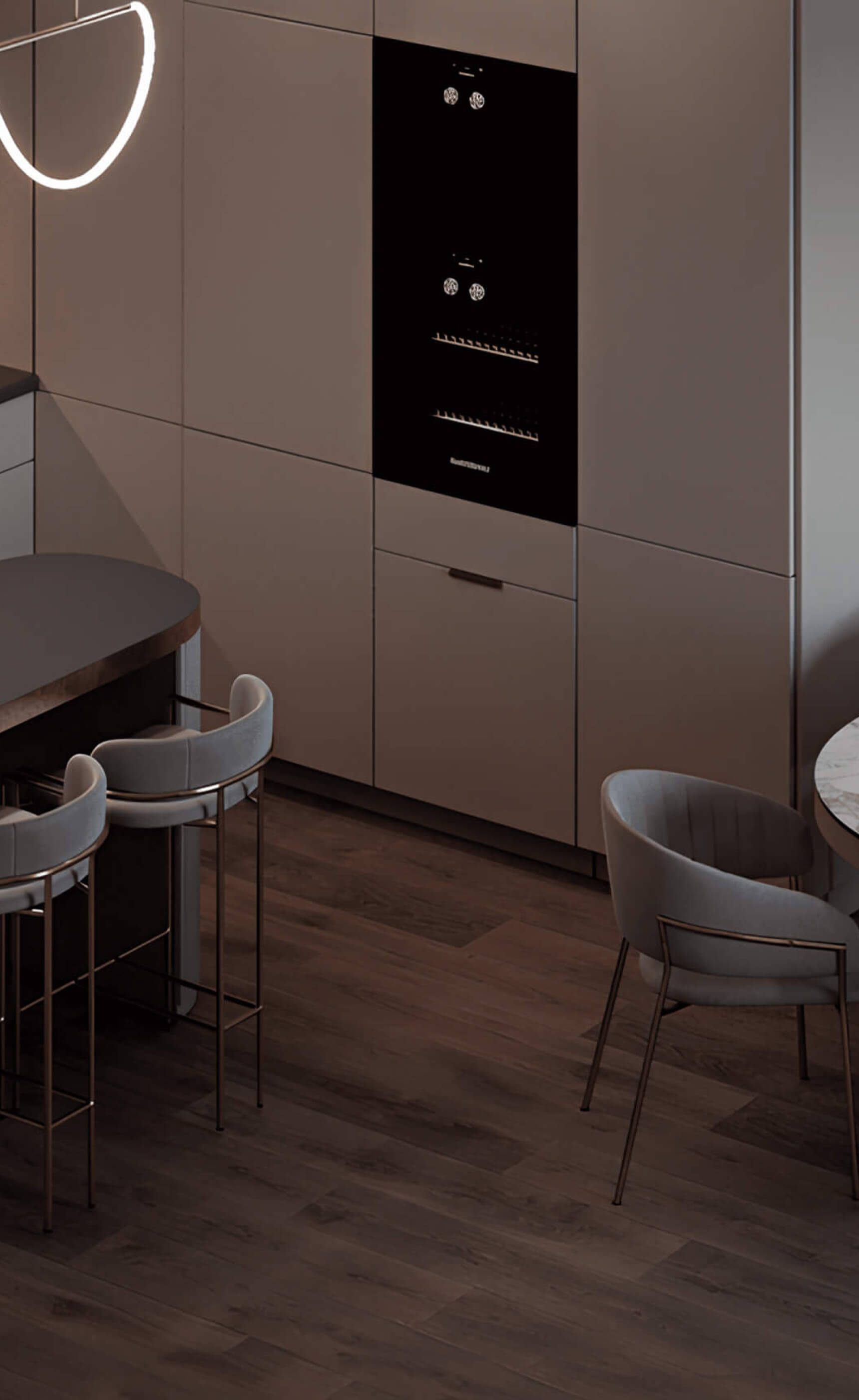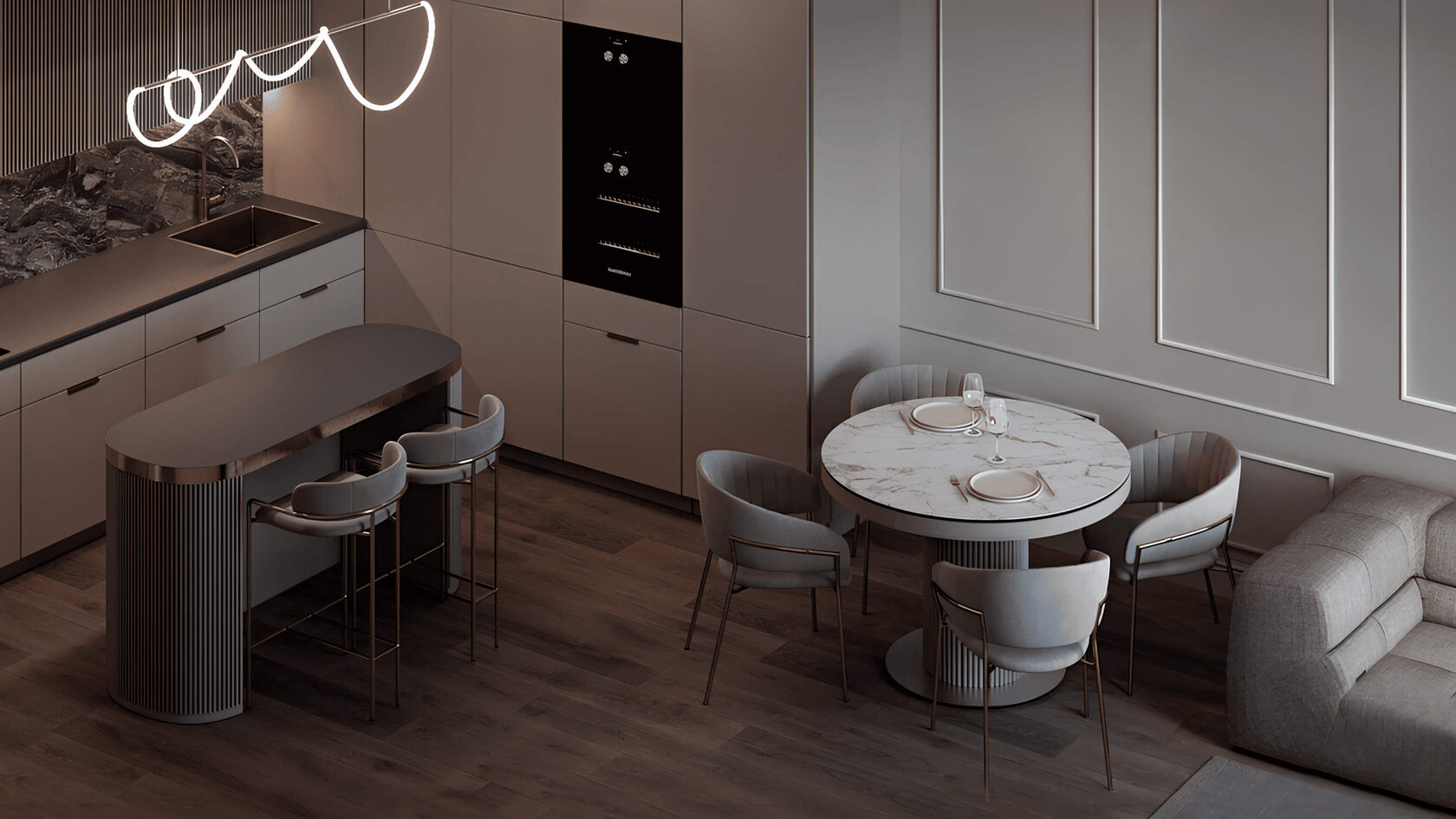 Для того чтобы не перегружать гостиную-столовую крупногабаритной техникой, холодильник переносится в подсобное помещение у входа. Также там размещены шкафы для хранения и прачечная.