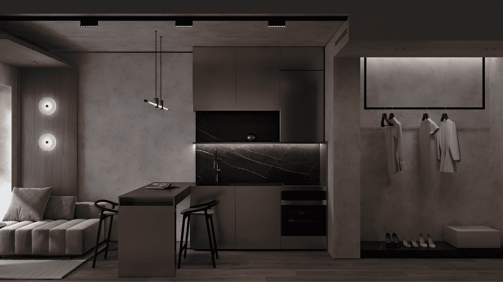 Квартира для мамы с дочерью. В данном проекте стояла задача разместить в 55 м2 2 спальни с санузлами, общую зону, отдельное помещение для хранения.